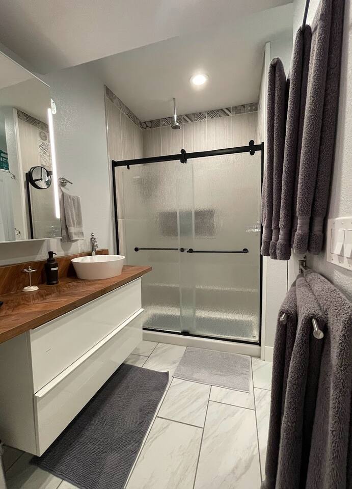 Thank you for your interest. You will enjoy a luxurious shower after a long day discovering the best of Denver and the Rocky Mountains! And after you get settled come out back to enjoy our 180° (shared with owner) backyard deck views of the unforgettable Colorado sunsets. And if you like your kitchen is fully stocked to cook your own meals. We love having guests and your private basement level apartment has all of the amenities for a relaxing trip. The comfort starts with plush wall to wall carpeting in most rooms. For your sleeping pleasure our two bedrooms have king and queen beds that accommodate up to 4 guests. In addition, two small guests can use our sleeper sofa. And we have a crib for families. In the bath, we provide hair dryer, plush towels and for the shower a luxurious rain head. The bath also includes an LG washer and dryer. In the kitchenette, we have provided a two burner electric stove, toaster, microwave, K Cup & regular coffee maker and two mini fridges. In the living room, you have an 46" HDTV, cable, WiFi Hi-Speed Internet and USB Jacks in some outlets for charging and all the best Streaming Channels. You have full access to wake up in the morning and enjoy your morning coffee OR an evening beverage on the back yard deck facing the Rocky Mountains (Closed in the Winter) In the morning go for a run around our community.